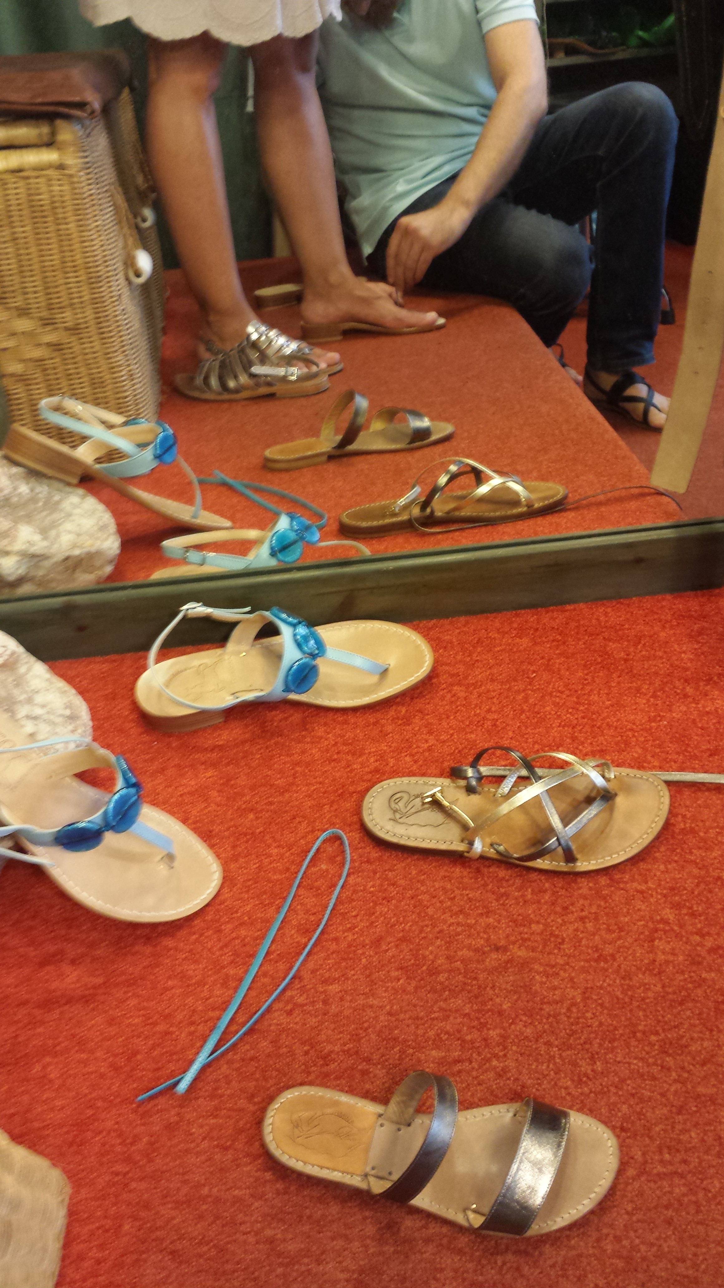 Il s’agit de l’atelier-boutique de deux jeunes artisans qui créent des sandales, aussi sur mesure. On est accueilli par Luigi, un jeune originaire de le Campanie, très sympathique. A peine rentrée il comprend que j’ai quelque chose à faire avec la France et pourtant je lui parle en italien, mais amusé Luigi montre du doigt mes tropézienne « il n’y a que les Français qui portent ça, et d’ailleurs on vend beaucoup aux touristes transalpins ».